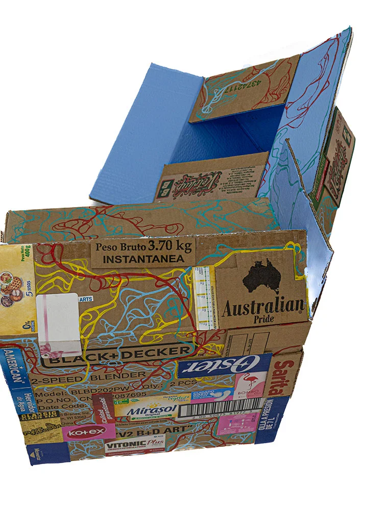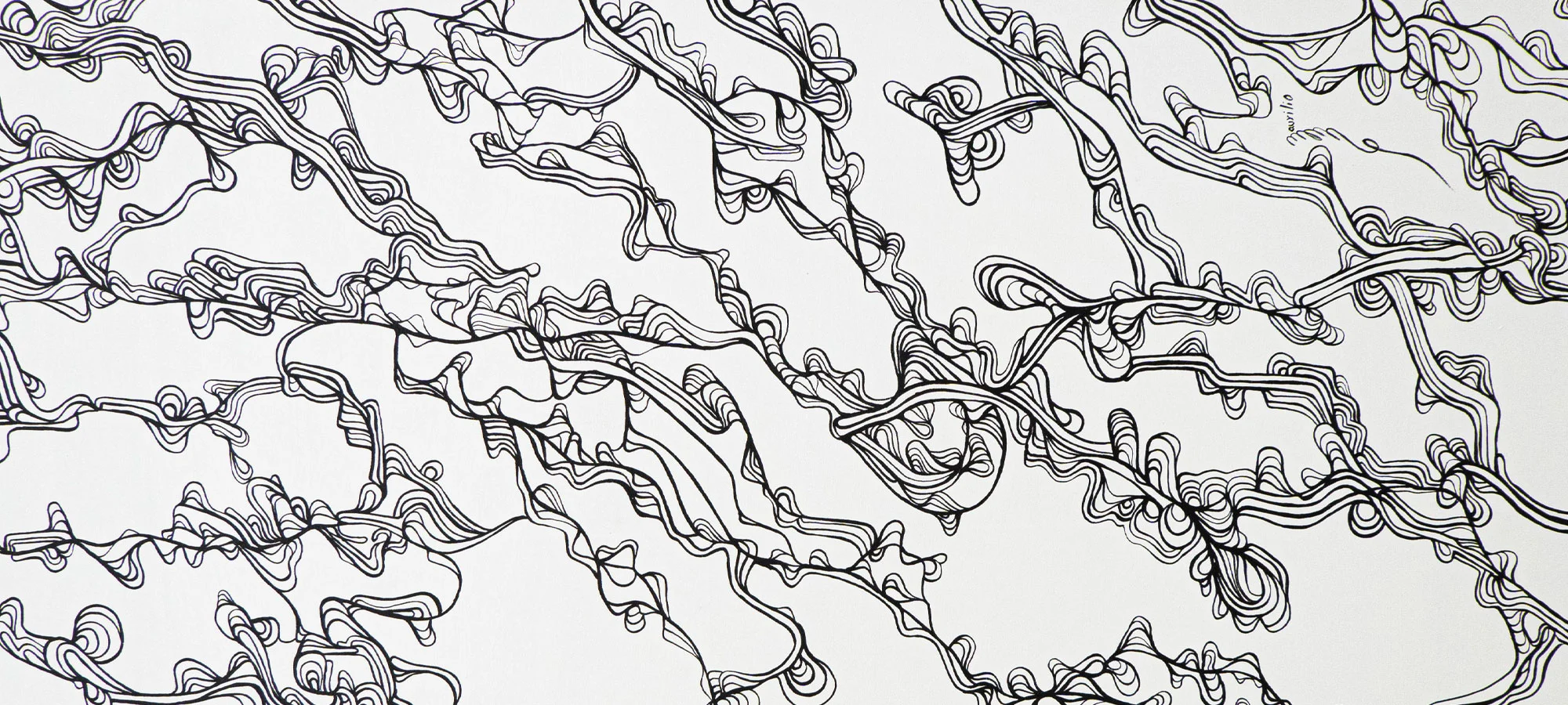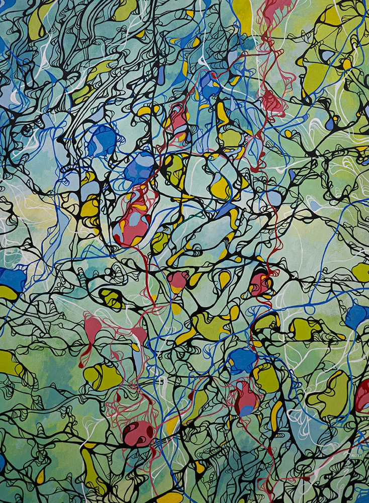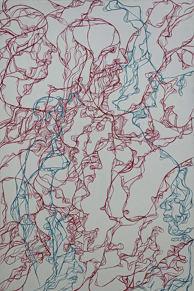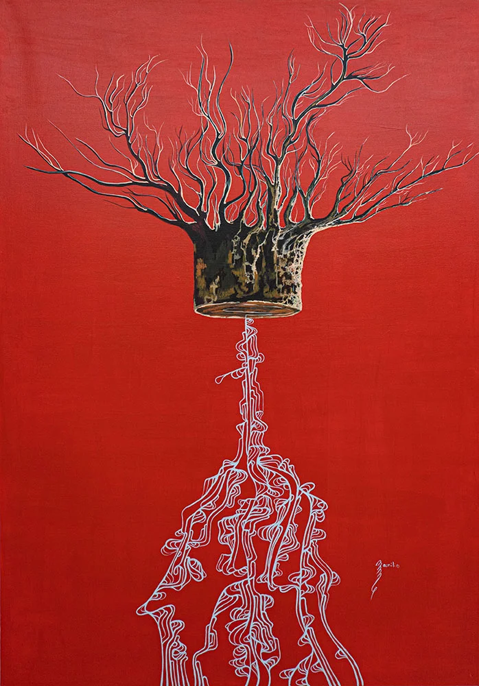 Su diestro uso del dibujo y la pintura crea una cautivadora narrativa multidimensional. Sus obras, que parecen abstractas al principio, contienen verdades ocultas que nos atraen para explorar los mensajes y códigos visuales incrustados en ellas.