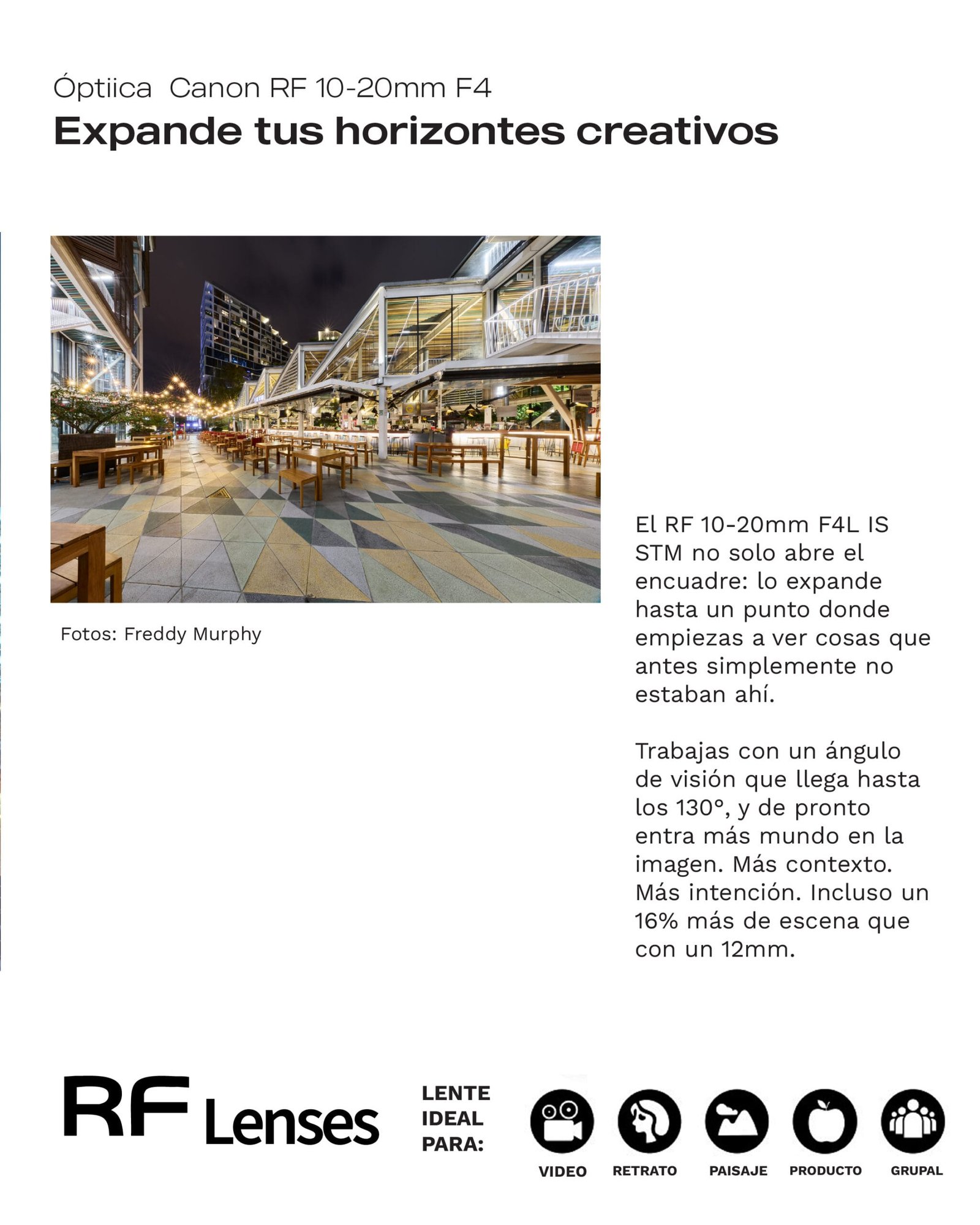 El Canon RF 10-20mm redefine el ultra gran angular con una perspectiva extrema y control total del espacio. Ideal para fotografía y video profesional donde cada encuadre cuenta una historia.