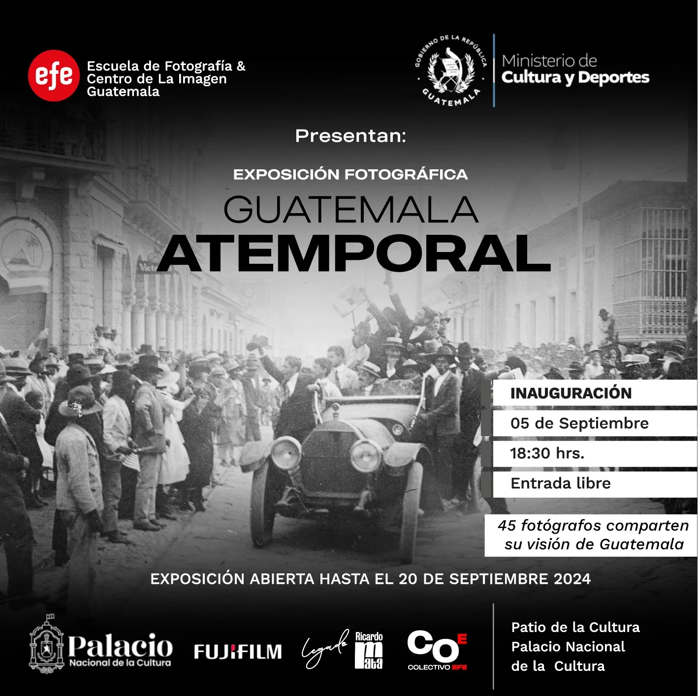 El Palacio Nacional de la Cultura es la sede de la exposición fotográfica Guatemala Atemporal, una muestra que reúne 110 obras de 47 artistas seleccionados, miembros del colectivo de la Escuela de Fotografía Efe, Legado Ricardo Mata y artistas internacionales. La exposición se inauguró como parte de las actividades del mes patrio y estará disponible al público hasta el 20 de septiembre con entrada gratuita.