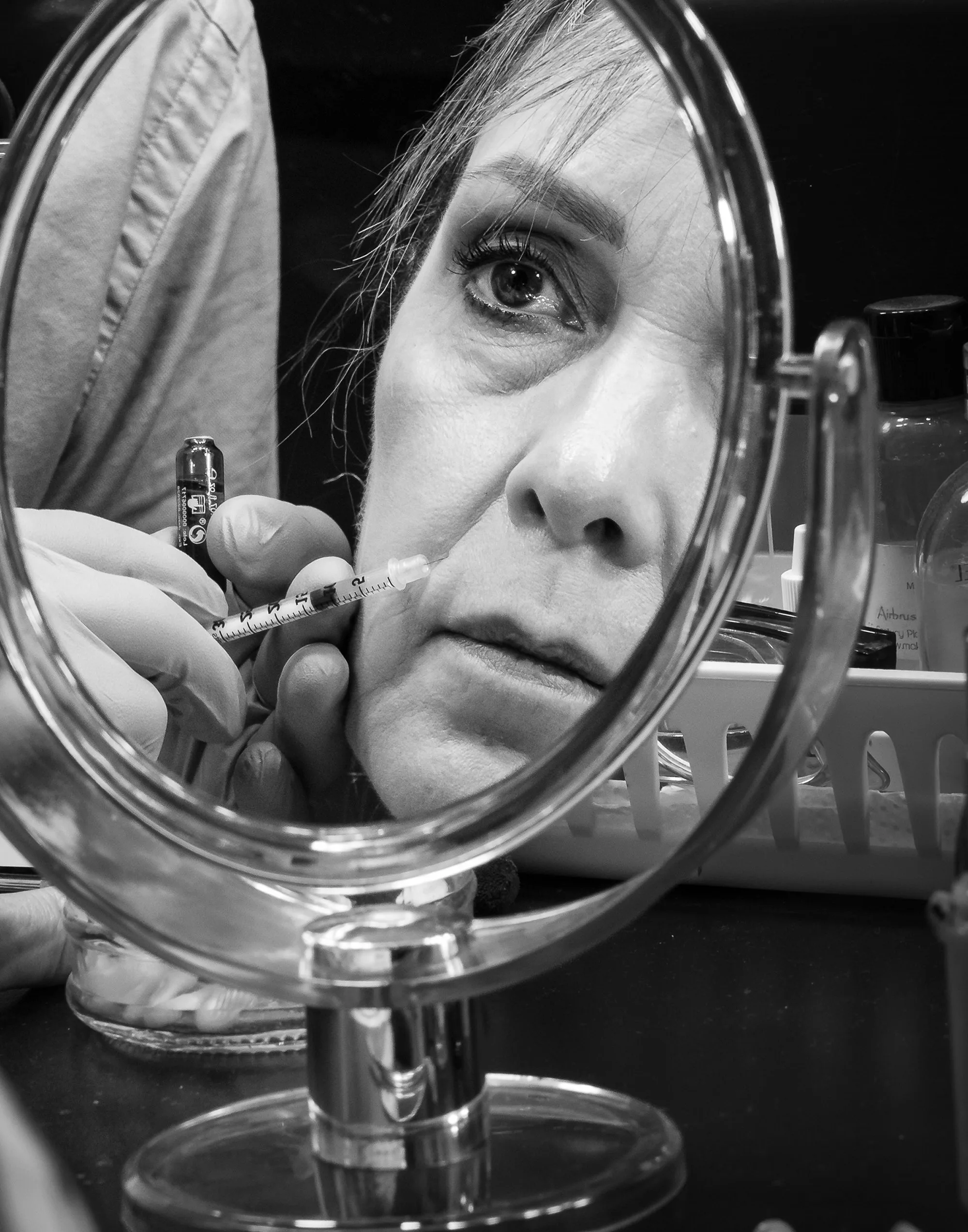 Es una serie fotográfica que revela las sombras del miedo social contemporáneo: Un temor silencioso pero persistente que nace del juicio, la comparación y la imposición de estándares inalcanzables a través de imágenes simbólicas, cargadas de una autopercepción alterada. Esta obra denuncia como la realidad actual, intensificada por las redes sociales, distorsiona la percepción del cuerpo, del valor propio y del paso natural del tiempo.