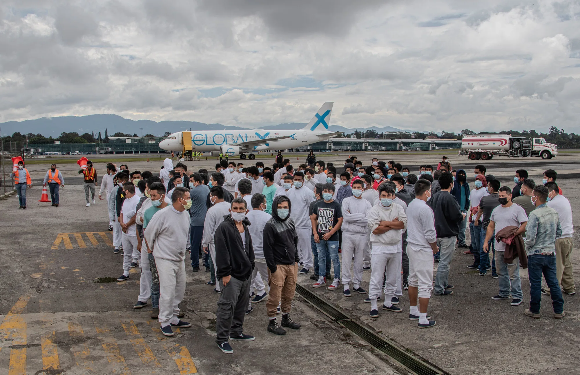 Esta serie de tres fotografías documenta el momento silencioso y denso en que decenas de personas migrantes retornadas descienden de un avión en el Aeropuerto Internacional La Aurora en la Ciudad de Guatemala. Esta es una escena que se repite día con día, varias veces al día, una tragedia que se normaliza y nadie quiere ver. Un promedio de 80.000 personas son retornadas involuntariamente desde Estados Unidos y México cada año. En cada imagen el lente acompaña el mismo gesto colectivo desde distintas distancias. Estas personas —recién llegadas, marcadas por el trayecto y la deportación— no solo enfrentan el dolor del retorno forzado, sino también el peso invisible del miedo social. Un miedo que no es suyo, sino que les es proyectado por la sociedad que los recibe con sospecha, prejuicio y exclusión. Son tratados como amenaza, como ajenos, como “otros”.