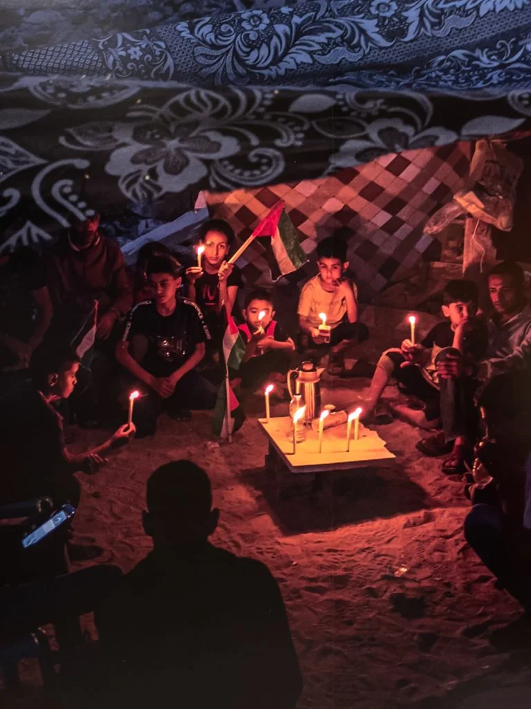 El uso de colores contrarios nos permiten ver, que en un pequeño lugar de ese congelado infierno existe un punto débil de calor humano, superado en número por los niños, principales víctimas de un conflicto que nadie entiende. Las luces de las velas nos muestran ese débil palpitar, como un cuerpo que aún no muere, pero está cerca de estarlo. En el contexto de otras culturas pareciera que realizan un velorio prematuro de sus propios cuerpos.